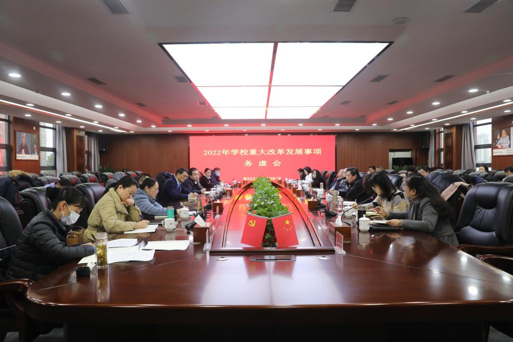 为进一步集聚智慧、凝聚力量,科学部署和统筹推进当前及今后一段时期学校改革发展有关重大事项,2022年1月28日上午,学校在云潭南路校区教学科研楼三楼会议室召开2022年重大改革发展事项务虚会,全体校领导出席会议,各部门、各学院主要负责人参加会议。会议由党委副书记、校长汤健主持。