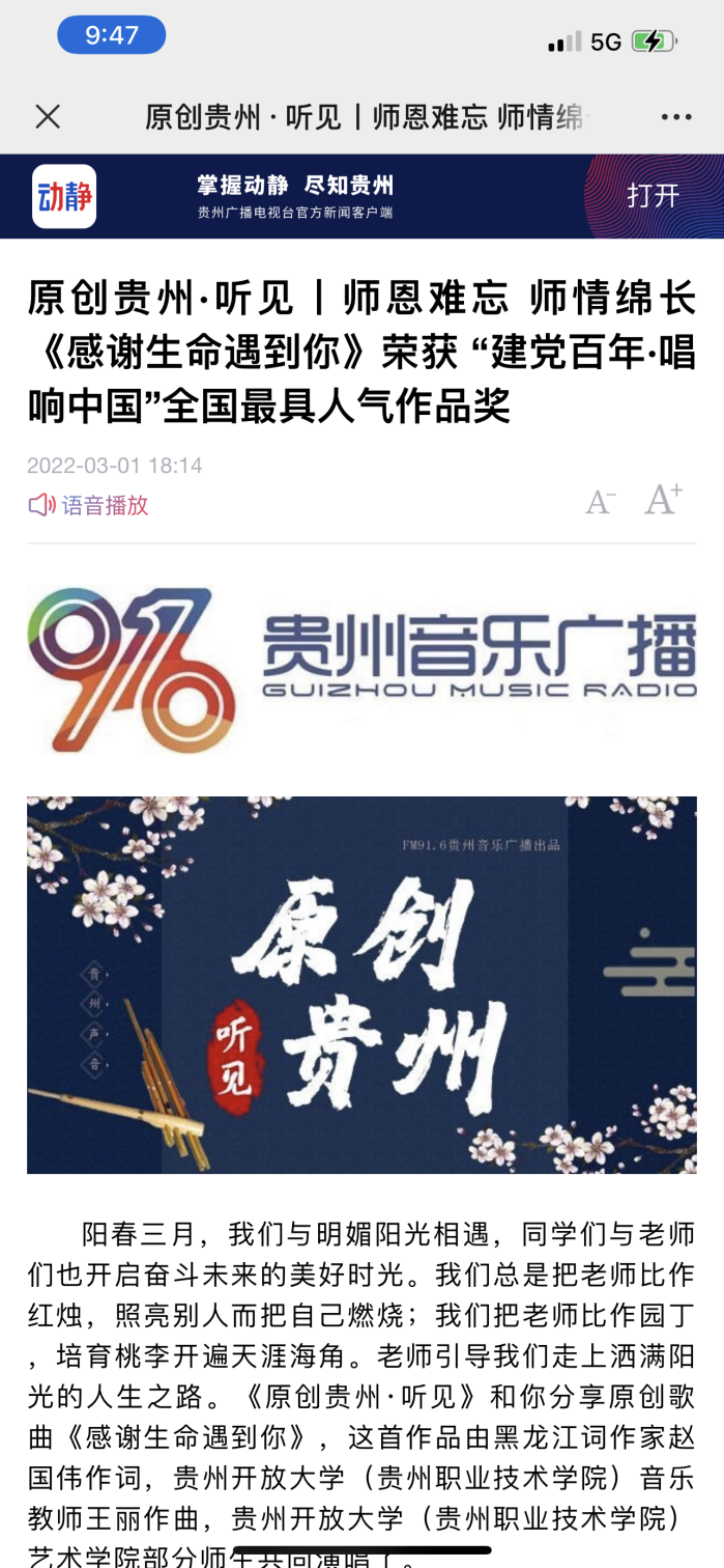 近日,新华社新媒体中心和中国音乐家协会联合发起的“建党百年·唱响中国”主题MV征集结果揭晓。由赵国伟作词,我校艺术学院教师王丽作曲的歌曲《感谢生命遇到你》荣获最具人气作品奖。据悉,参加本次活动不乏国内众多著名词曲作家、歌唱家的作品。《感谢生命遇到你》是此次评奖中贵州省唯一获奖的歌曲。