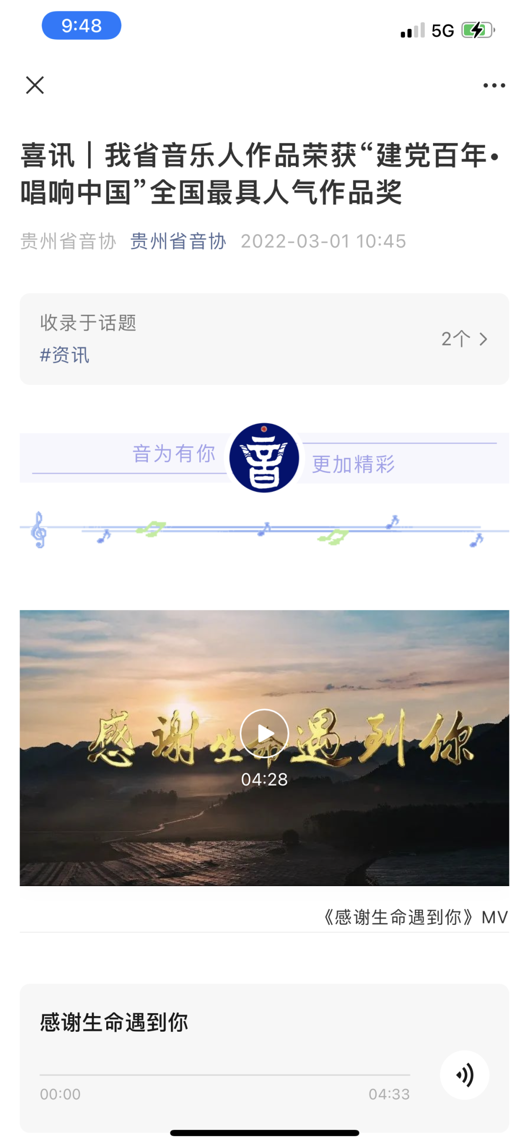 歌曲《感谢生命遇到你》在新华社客户端的播放量突破156.4万,还相继被中国教育电视台、中国教育报、人民日报、新华网、澎湃新闻、贵州音乐广播、腾讯视频、好看视频等媒体推送,总播放量破200万。歌曲由小视角、小个体切入,歌颂青年学子对这个时代发自内心的赞美,对美好校园生活和老师的感恩之情。歌曲采用流行风格进行创作,主题鲜明,自然流畅,富于青春浪漫气息,得到广大网友的一致好评,向全国宣传了学校的良好形象,也充分发挥了音乐文化在立德树人、培根铸魂上的独特作用。