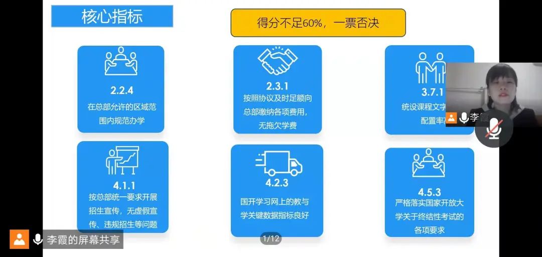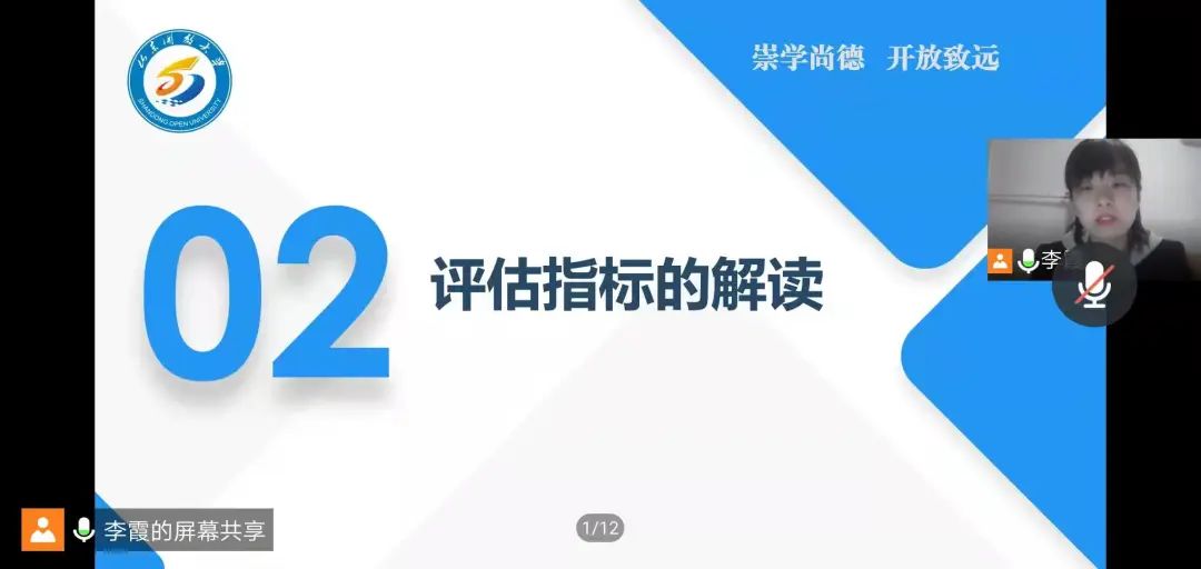 在山东开放大学分会场,特邀专家李霞副教授针对迎评准备工作和评估指标体系两大方面进行了分享交流。李霞副教授从评估的部署、指标的分解、材料的准备、档案的整理、评估的实施等多个方面详细介绍了山东开放大学的经验和做法,又对“国家开放大学分部办学评估指标”的6个一级指标,25个二级指标和61个三级指标进行了逐项分析解读,培训内容具体详实。