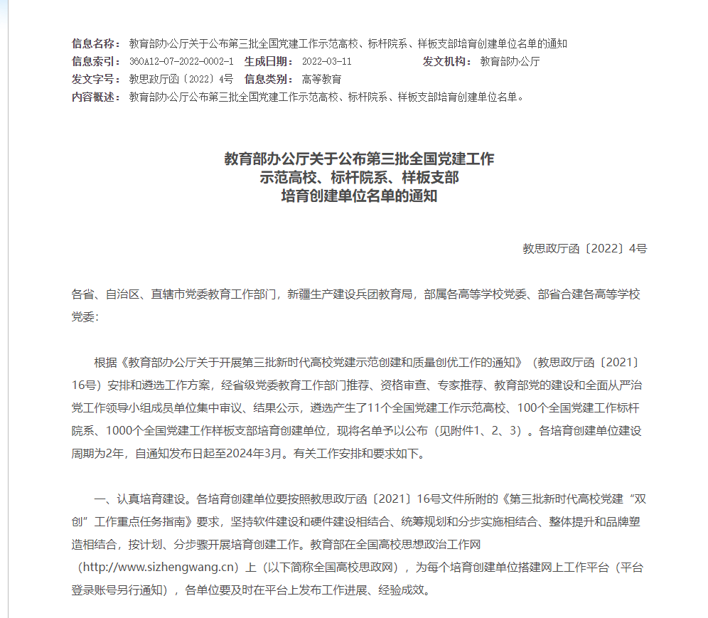 近日,教育部办公厅印发《教育部办公厅关于公布第三批全国党建工作示范高校、标杆院系、样板支部培育创建单位名单的通知》,根据《教育部办公厅关于开展第三批新时代高校党建示范创建和质量创优工作的通知》(教思政厅函〔2021〕16号)安排和遴选工作方案,经省级党委教育工作部门推荐、资格审查、专家推荐、教育部党的建设和全面从严治党工作领导小组成员单位集中审议、结果公示,遴选产生了11个全国党建工作示范高校、100个全国党建工作标杆院系、1000个全国党建工作样板支部培育创建单位。我校组织部获第三批“全国党建工作样板支部”培育创建单位。