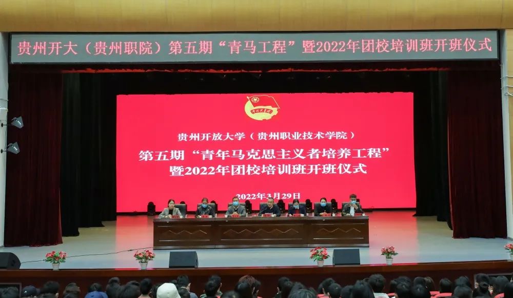 3月29日,贵州开放大学(贵州职业技术学院)第五期“青马工程”暨2022年团校培训班开班仪式在学校大礼堂举行。学校党委副书记龚辉出席,马克思主义学院、党委学工部负责同志、校团委全体、各学院团总支书记及“青马班”、团校全体学员参加开班仪式。