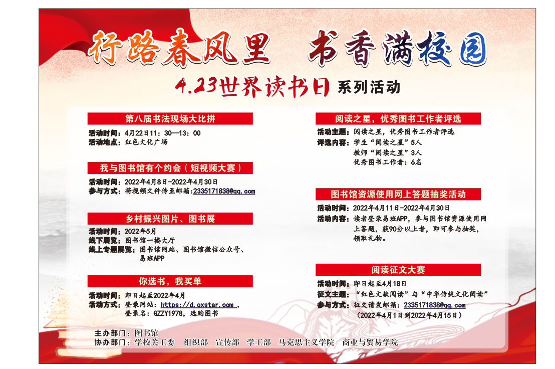 为持续推进4.23世界读书日系列活动,激发全校师生读书热情,营造积极良好的读书氛围,丰富我校师生课余文化生活,图书馆以“行路春风里,书香满校园”为主题,陆续开展了“第八届书法现场大比拼”“我与图书馆有个约会”短视频大赛、“红色文献阅读”与“中华传统文化阅读”主题征文大赛等系列活动。