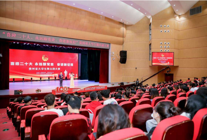 大赛开幕式在《青春力量——贵州省大学生舞台剧大赛纪实》视频的播放中正式拉开帷幕。龚辉代表学校致欢迎辞,他表示本次舞台剧大赛以文化艺术的形式开展“喜迎二十大、永远跟党走、奋进新征程”主题实践教育,学习宣传贯彻习近平总书记在庆祝中国共产主义青年团成立100周年大会上的重要讲话精神和省第十三次党代会精神,引导鼓励大学生进行舞台剧文化创作,展现当代大学生勇于创新、意气风发的精神面貌和不负时代、不负重托的历史责任心,赓续红色血脉,展现青春风采。任刚毅介绍了舞台剧大赛网络展播情况,本次大赛通过网络点赞的形式开展线上展播,参与人数达53万多,网络投票达128万,网络人气高、社会关注度大,产生了较大的影响力,为喜迎党的二十大召开营造了浓厚的氛围。李剑在讲话中指出,贵州省大学生“喜迎二十大、永远跟党走、奋进新征程”舞台剧大赛,就是要以艺术之美赓续“坚定不移跟党走,为党和人民奋斗”的初心使命,以青年之声发出“请党放心、强国有我”的青春誓言,以青春之名献礼党的二十大。他希望参演团队以最饱满的热情深情演绎,尽情讴歌党、祖国、人民和英雄,厚植爱党爱国情怀,引领更多青年永远跟党走,争做时代先锋,用奋斗践行“请党放心、强国有我”的青春誓言,用实干谱写多彩贵州现代化建设新篇章,以优异成绩迎接党的二十大胜利召开!