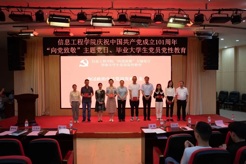 为庆祝中国共产党成立101周年,6月23日下午,信息工程学院在图书馆学术报告厅举行“向党致敬”主题党日、毕业生党员党性教育暨2020级学生实习动员教育大会。学校党委委员、副校长李勤,党委组织部、党委宣传部负责人出席活动。信息工程学院班子成员、教职工党员代表、毕业生党员代表、发展对象、入党积极分子和2020级学生代表参加活动。