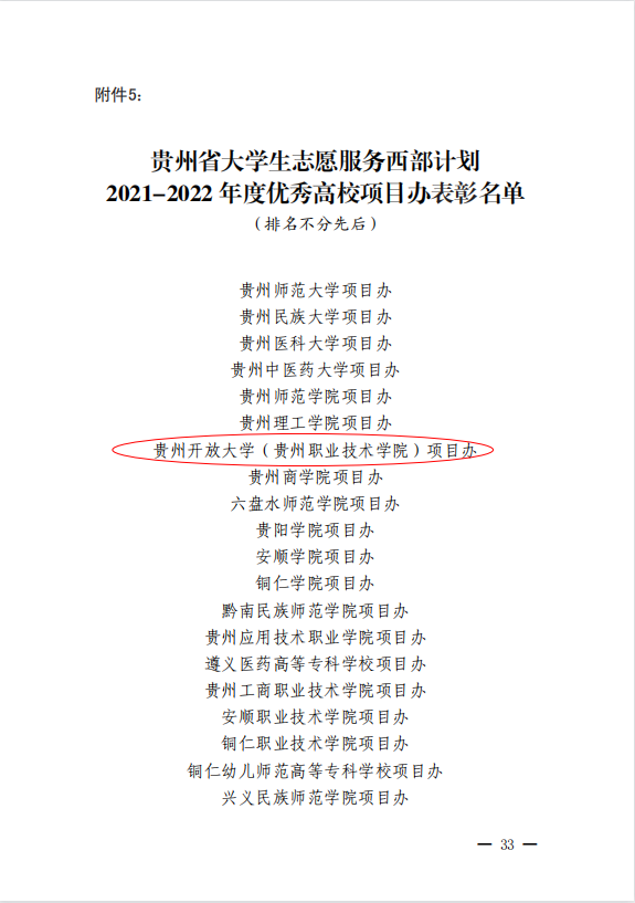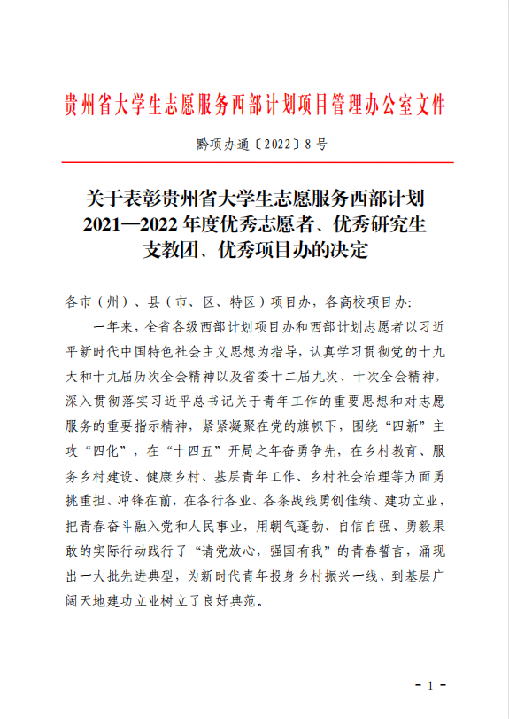 近日,贵州省志愿者协会、贵州省大学生志愿服务西部计划项目管理办公室联合印发《关于表彰贵州省大学生志愿服务西部计划 2021—2022 年度优秀志愿者、优秀研究生支教团、优秀项目办的决定》,我校“西部计划”项目办(校团委)获得“优秀高校项目办”,李灯欣等12名服务于贵州基层一线的“西部计划”志愿者获得“优秀志愿者”称号。