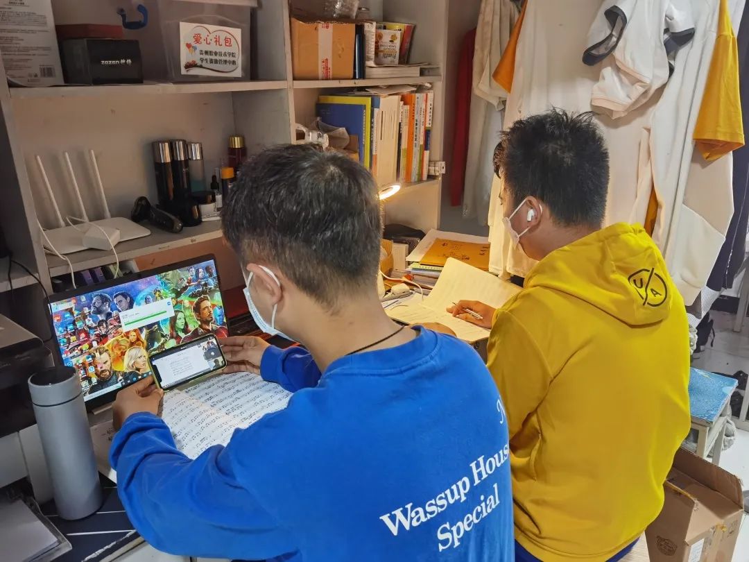 汹涌而来的疫情让人措手不及,指导学生做核酸、保障学生生活物资、督促学生上网课、护送学生紧急就医……在党旗的号召下,艺术与设计学院每一位党员和志愿者奔跑于学院大楼、学生宿舍、学校操场、物资分发点、核酸检测点等地,竭尽所能守护着每一位学生的“平安”,忙碌到夜声人静时才想起给家里人报个“平安”。“你们好好待在家里,我这里一切都好,帮我亲一下宝宝,疫情结束后,妈妈就回家了”。夜里时分,在挂断了和家人及一岁的孩子通话后,学院刘老师便和大家一起又一次来到学生宿舍,看望被疫情“困住”的孩子们的生活学习情况,聆听同学们的心声。