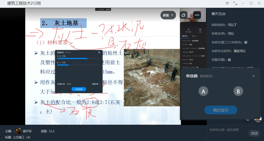 工程测量教研室的陆晓东老师充分发挥了“线上教学”+“线下自学”混合教学模式的优势,在课前通过“课程钉钉群”发布了课程相关的视频资源和配套课件,在课堂上着重围绕重点和难点进行讲解,并积极与学生进行互动,最后通过软件布置了讨论内容和作业。