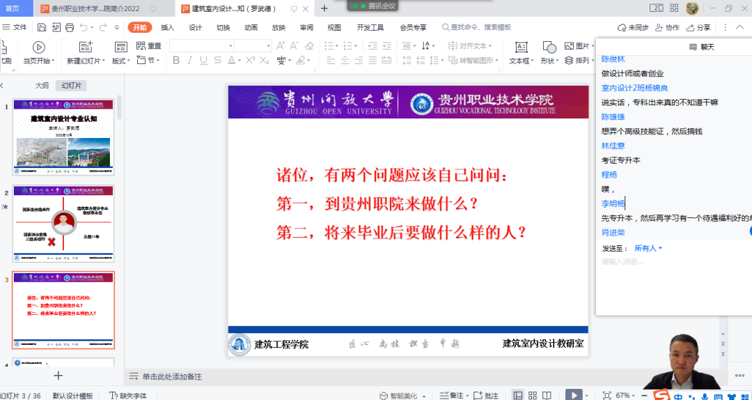 新生入学怀揣期待,同时也有迷茫。建筑工程学院的专业教师与同学们云上见面,介绍师资队伍、专业课程、专业现状、专业前景,帮助新生了解专业特点及发展方向,进一步激发学习兴趣,明确学习目标。引导同学们从入学开始就胸怀家国责任、坚定理想信念、锤炼品德修为、练就过硬本领,汲取智慧和精神力量,将“大国工匠”的鲁班精神薪火相传,做奋发有为的青年。