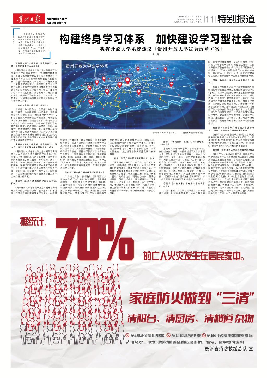 2022年12月30日,《贵州日报》第11版对我校进行特别报道,文章标题为《构建终身学习体系 加快建设学习型社会—我省开放大学系统热议<贵州开放大学综合改革方案>》。