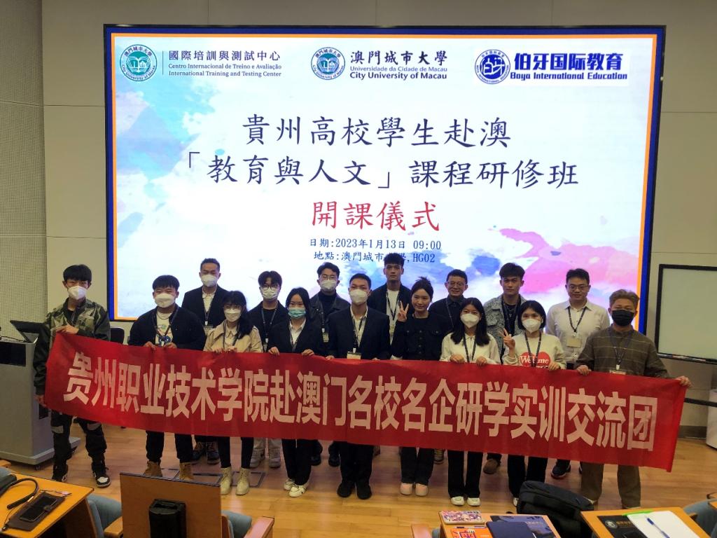 为落实新国发2号文件精神,做好贵州省“千人留学计划”项目,加强贵澳两地互动交流合作,在省教育厅的积极推动下,在伯牙国际教育协作下,我校国际学院精心组织筹备,从商业与贸易学院、航空学院、信息工程学院、艺术与设计学院、建筑工程学院遴选的15名优秀学生和1名带队教师,于1月4日至17日赴澳门开展为期14天的澳门名校名企研学实训活动。本次研学活动由来自贵州6所高校的60余名本、专科层次学生共同参与。