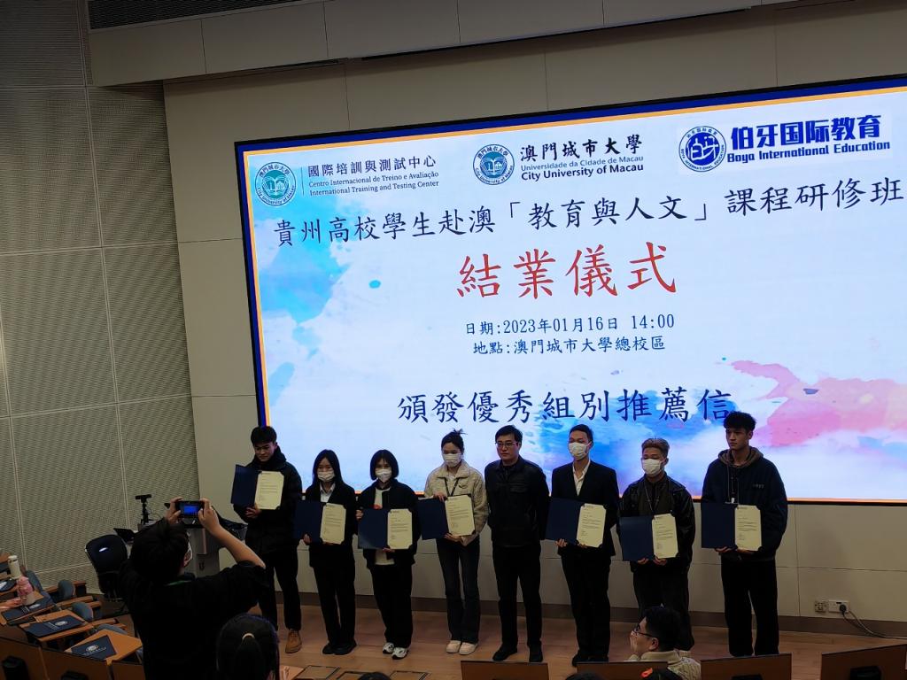 本次研学活动的主要交流院校为澳门城市大学。通过组织“教育与人文”课程研修班,邀请了澳门城市大学彭俊博士、欧阳白晓博士、李卓航博士、郑焯基博士等,就教育信息化发展、大学生职业生涯规划、教育心理等多个方面进行了探讨。开班仪式上,我校带队教师付伟宸代表学校对澳门城市大学表达了感谢及未来深入合作的期望,并与澳门城市大学校方代表互赠两校纪念品。在后续的课程教学实训中,我校同学积极学习,全员获得《结业证书》,并在结业汇报中表现优秀,最终在9个小组中脱颖而出,名列前30%,获得了优秀学员及澳门城市大学的推荐信。