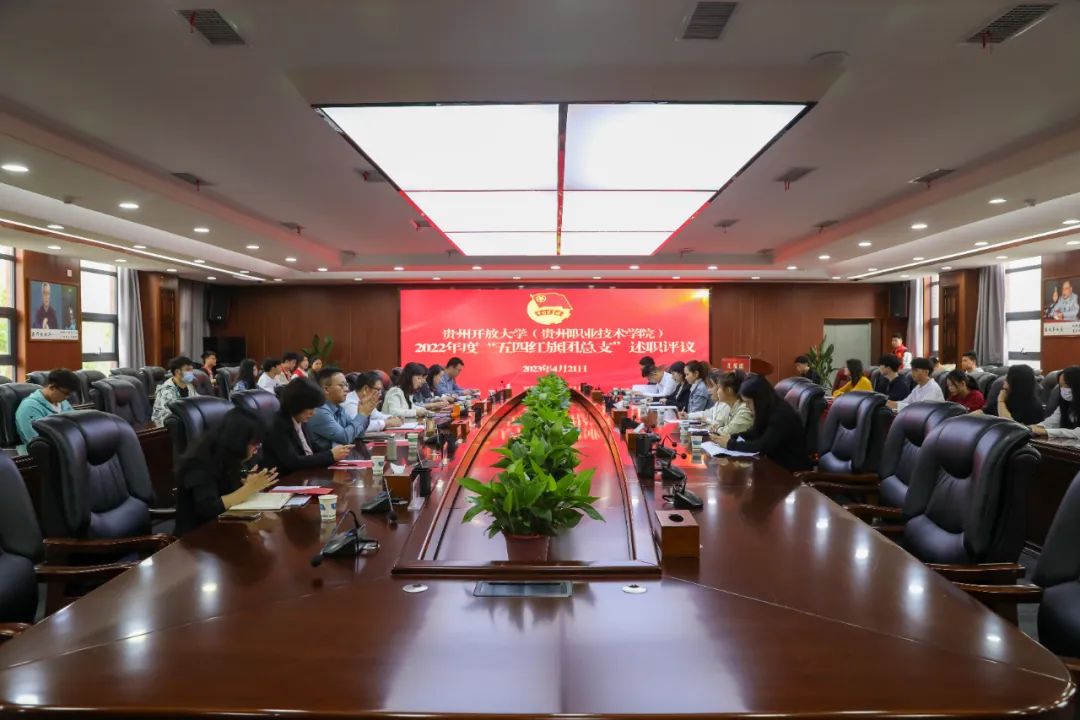 为深入学习贯彻党的二十大精神,全面总结2022年以来学校共青团的工作,挖掘特色亮点,表彰先进,促进相互学习,进一步夯实基层团建,凝聚青春力量,4月21日上午,贵州开放大学(贵州职业技术学院)2022年度“五四红旗团总支”述职评议会在科研楼三楼会议室进行,党委学生工作部、校团委负责人,各学院党委书记、副书记出席评议会并担任评委,各学院团干部、团员代表参加会议。会议由校团委书记李雪芬主持。