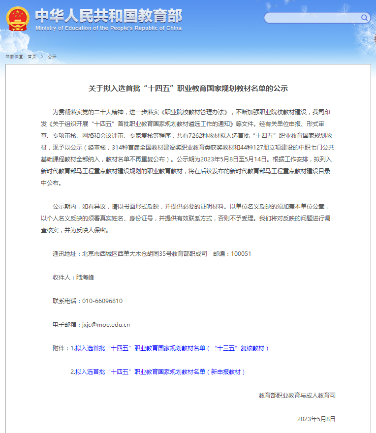 据悉,为贯彻落实全国职业教育大会和全国教材工作会议精神,根据《“十四五”职业教育规划教材建设实施方案》,教育部2021年12月13日发布了《关于组织开展“十四五”首批职业教育国家规划教材遴选工作的通知》,组织开展“十四五”职业教育国家规划教材建设工作。申报程序经有关单位申报、形式审查、专项审核、网络和会议评审、专家复核等环节,最终共有7262种教材入选首批“十四五”职业教育国家规划教材,高职专科2326种。