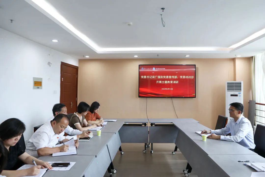 为深入推进学习贯彻习近平新时代中国特色社会主义思想主题教育,6月14日下午,学校党委书记宋广强到分管部门党委宣传部、党委统战部开展调研。