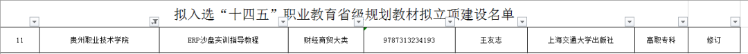 7月10日,贵州省教育厅发布《关于拟入选首批“十四五”职业教育省级规划教材和立项建设教材名单的公示》,我校《职业基本素养》《信息技术基础》《纳税实训》《直播电商实战》4本教材入选贵州省首批“十四五”职业教育省级规划教材,《ERP沙盘实训》1本教材获省级规划立项建设,实现了我校在省级规划教材建设上新的突破!