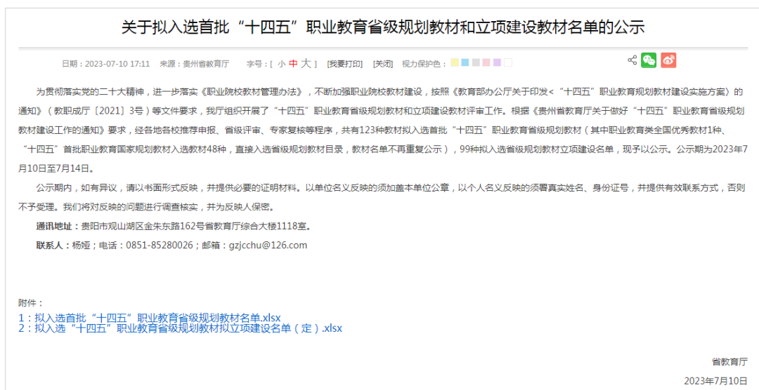 据悉,为贯彻落实党的二十大精神,进一步落实《职业院校教材管理办法》,不断加强职业院校教材建设,按照《教育部办公厅关于印发<“十四五”职业教育规划教材建设实施方案〉的通知》(教职成厅〔2021〕3号)等文件精神,贵州省教育厅于2022年12月7日发布了《省教育厅关于开展“十四五”职业教育省级规划教材建设有关工作的通知》,组织开展了首批“十四五”职业教育省级规划教材建设工作。经学校推荐申报、省级评审、专家复核等程序,全省职业院校共有123种教材入选首批省级规划,99种教材入选省级规划立项建设名单。