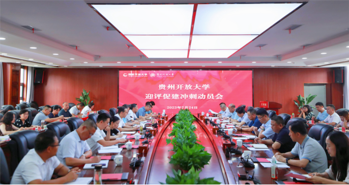 为决战决胜贵州开放大学办学评估,更加精准精细精致做好迎评促建工作和专家现场评估考查的各项准备工作,2023年7月24日下午,学校召开了办学评估迎评冲刺动员会,学校党委副书记、校长汤健,党委委员、副校长周勇,市(州)分校、水钢分校、开放教育学院主要领导和分管评估工作校领导,省校评估指标各责任部门主要负责人及评建办全体人员参加了此次会议。会议由汤健主持。
