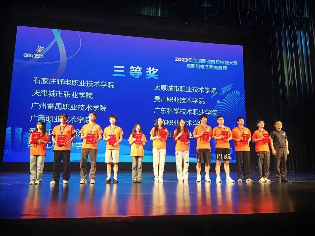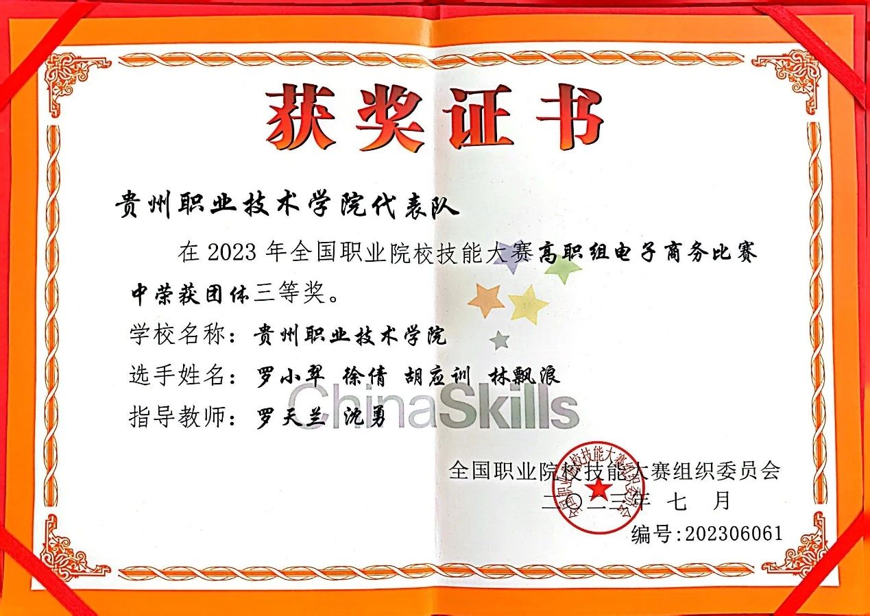 2023年全国职业院校技能大赛高职组电子商务赛项于7月25日正式开赛,来自全国各地74支参赛队伍齐聚广东珠海横琴粤澳深度合作区的容闳公学体育馆同台竞技。由我校商业与贸易学院教师罗天兰、沈勇指导的2021级和2022级电子商务专业学生林飘浪、胡应训、罗小翠和徐倩四位同学荣获国家级团体三等奖。