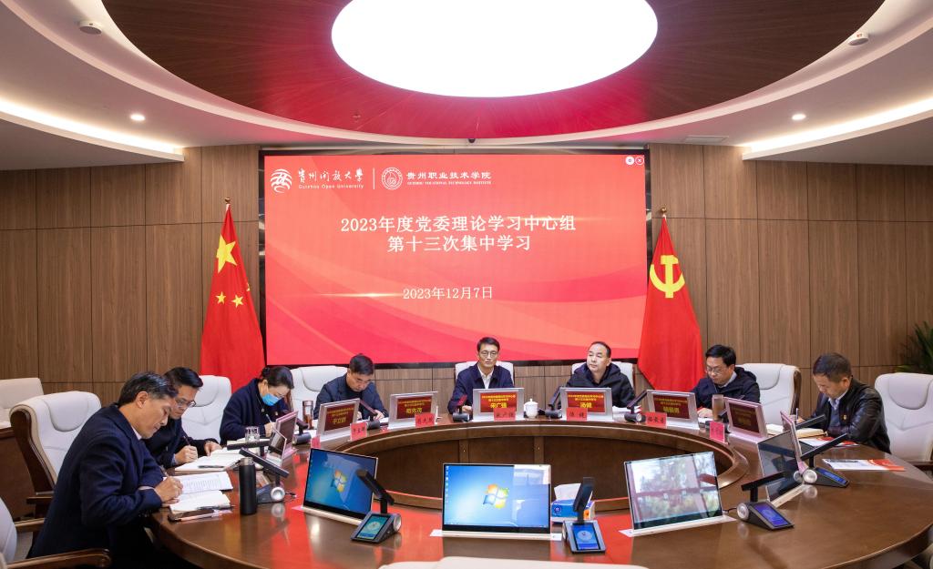 为深入学习贯彻习近平法治思想,进一步提升学校领导干部的法治素养和依法治校能力,2023年12月7日上午,学校党委理论学习中心组(扩大)在行政楼二楼会议室开展第十三次集中学习。学校党委书记宋广强主持会议并讲话,党委班子成员参加会议,各基层党委书记、党委工作部门负责人列席会议。根据省委教育工委统一安排,贵州商学院党委委员、党委宣传部部长、党委统战部部长苟先茂等一行列席旁听并点评指导。