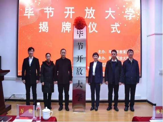 毕节市委教育工委副书记、毕节市政府副市长万艳出席揭牌仪式并致辞,指出今年以来,学校以“党旗耀毕开·红心育人才”党建品牌创建为抓手,确定了“12345”的工作思路,通过抓党建、强班子、壮队伍、谋改革、促教学、兴科研,各项工作取得明显成效。她希望毕节开放大学上下一心、踔厉奋发,着力从三个方面谋划推动好开放教育的高质量发展。一要认真抓好统筹督促,加快建设开放教育体系步伐。二要认真抓好转型发展,紧贴社会需求提供优质服务。三要认真抓好品质提升,办好让人民满意的开放教育。