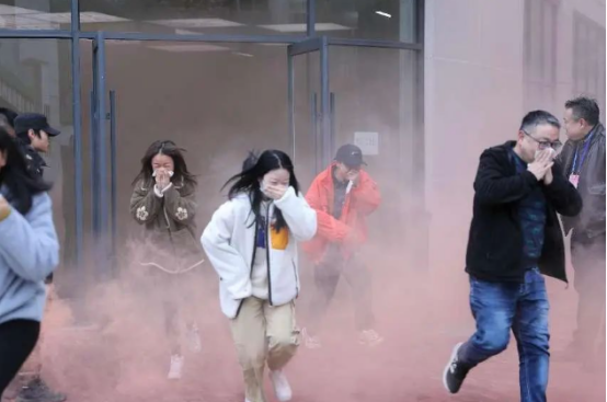 按照演练预设场景,上午9时15分,远程教育大楼一层通道发现火情,现场顿时浓烟滚滚,学校中控室接警后,立即报告应急演练工作小组启动应急预案,相关人员立即奔赴现场,紧急疏散群众,组织抢险救灾。所有参演人员接到疏散信号后在各层疏散引导人员的指挥下,有序撤离到楼下的安全区域,并及时清点人数。