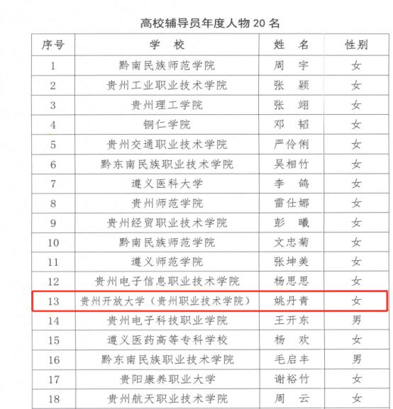 在省教育厅组织开展的2023年“最美高校辅导员”暨2023年“高校辅导员年度人物”推选展示活动中,我校推荐的艺术与设计学院辅导员姚丹青老师喜获2023年贵州省“高校辅导员年度人物”称号。