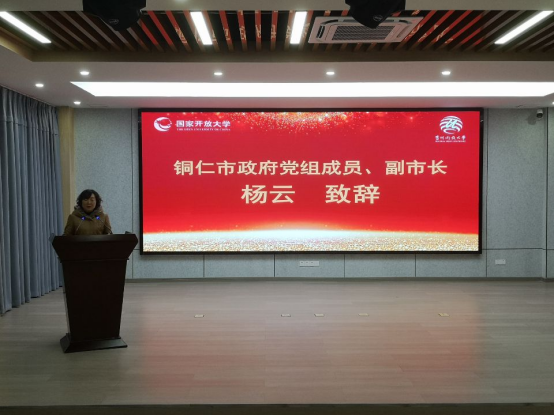 铜仁市人民政府党组成员、副市长杨云为揭牌仪式致辞,在致辞中充分肯定铜仁广播电视大学办学44年来所取得的成绩,在市委、市政府的领导下,铜仁广播电视大学紧贴社会发展需要,成为服务铜仁现代远程开放教育和终身教育的重要阵地,为铜仁市经济社会发展和人才培养作出了积极贡献。希望铜仁开放大学在新的历史起点上:一要把握机遇,持续推进转型发展。逐步推进办学体制创新,增强办学潜力,激发办学活力,为创办高质量新型成人高校打下坚实基础。二要抓好服务,聚焦全民终身学习。打造学习服务平台,深入实施教育教学改革,不断提高开放教育、社区教育、老年教育、社会培训的办学质量,为建设教育强国,促进形成“人人皆学、处处能学、时时可学”的学习型社会作出应有的贡献。三要深耕优势,坚持服务地方发展。立足开放大学覆盖广阔、灵活开放、资源丰富的特点,不断办好铜仁人民家门口的教育。
