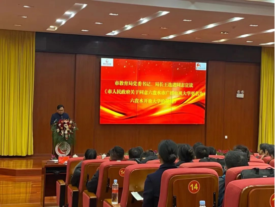 市教育局党委书记、局长王选进同志宣读《六盘水市人民政府关于同意六盘水市广播电视大学更名为六盘水开放大学的批复》。并代表市教育局对六盘水开放大学揭牌表示了祝贺。