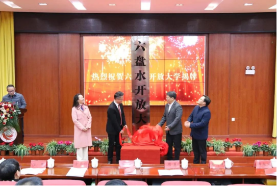 12月28日下午,六盘水开放大学隆重举行揭牌仪式,贵州开放大学党委委员、副校长周勇,市政府副市长提名人选、市政府秘书长陈泉,市教育局党委书记、局长王选进,市委党校常务副校长、市电大党委书记、校长幸雪梅等领导出席仪式并为我校揭牌。揭牌仪式由市人民政府副秘书长刘昆主持。市直有关部门及高校负责同志,各市(特区、区)教育局负责同志,各市(特区、区)职校负责同志,各社区教育示范基地负责同志,学校教职工等140余人共同见证学校发展史上具有里程碑意义的历史时刻。