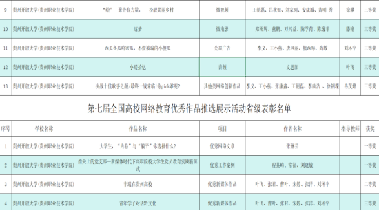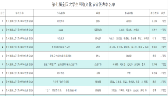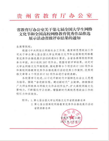 近日,贵州省教育厅公布第七届全国大学生网络文化节和全国高校网络教育优秀作品推选展示活动省级评审结果。学校喜获一等奖4项、二等奖6项、三等奖7项,获奖总数位列全省普通高等院校、高职院校前列。