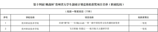 近日,第十四届“挑战杯”贵州省大学生创业计划竞赛在贵阳人文科技学院圆满落幕。根据组委会对省赛拟获奖项目公示,我校共有53项作品拟获省赛奖项,其中一等奖2项,二等奖8项,三等奖22项,优秀奖21项。