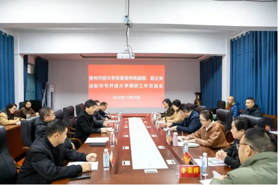 首先,调研组一行与毕节开放大学开展座谈交流。毕节开放大学党委书记、校长彭雄及有关负责同志参加座谈。会上,彭雄对调研组一行表示欢迎,并介绍了八大民主党派支持毕节试验区建设的概况及毕节开放大学工作情况。我校党委宣传部、党委统战部副部长张硕对学校统战工作基本情况进行介绍,民盟支部主委陈舒、知联会会长蔡昆、九三支社主委申小玲、欧美同学会会长陈莉娜就统战工作助力开放教育综合改革进行交流。她们表示,将依托“智汇统战”品牌建设,组织各民主党派成员及党外知识分子利用自身资源和优势,为毕节学习型社会建设蓄势赋能。