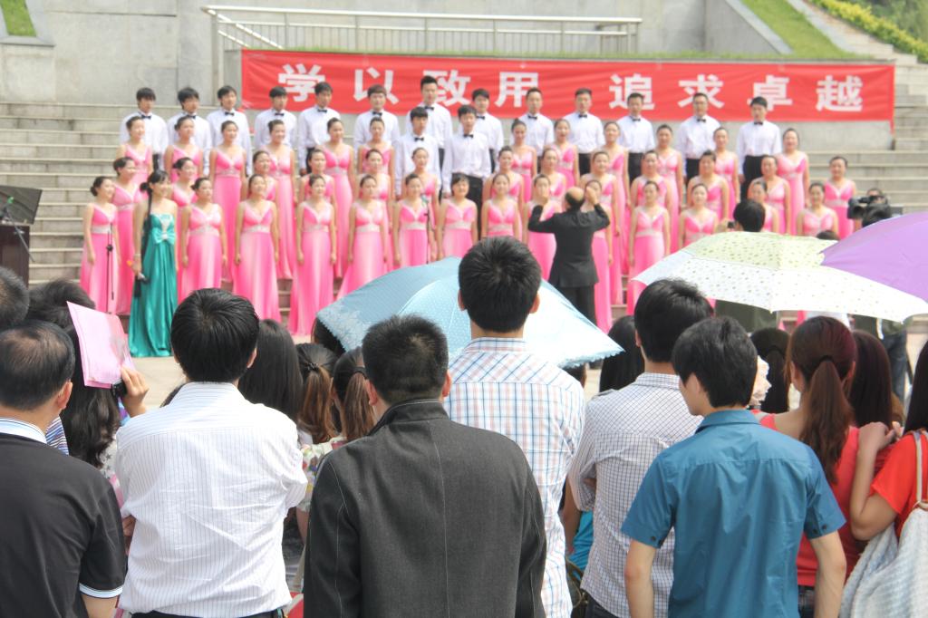 毕业典礼的最后,曾在全省高校校歌演唱大赛专科组中荣获第一名的合唱队,合唱了校歌和《摘菜调》,用自己的歌声为师兄师姐们祝福,祝福他们一路顺风,踏上新的征程。