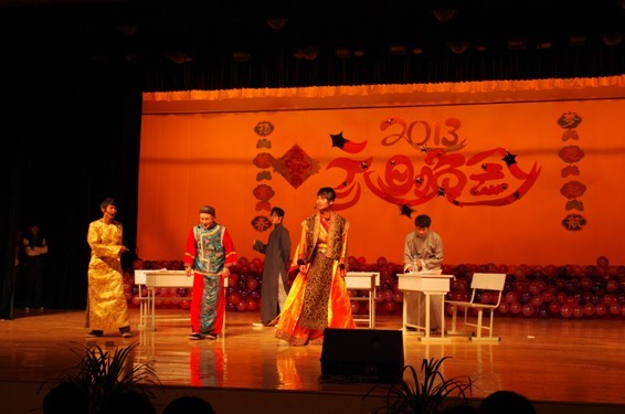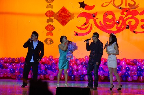 18时55分,商贸系全体教师通过会堂两侧大屏幕逐一以视频形式向全体师生拜年;19时整,在全场的倒数声中,红色的大幕缓缓拉开,一段劲爆的开场热舞后,光彩的舞台和四位衣着亮丽的主持人出现在大家的眼前,商贸系2013迎新晚会正式拉开了帷幕。
