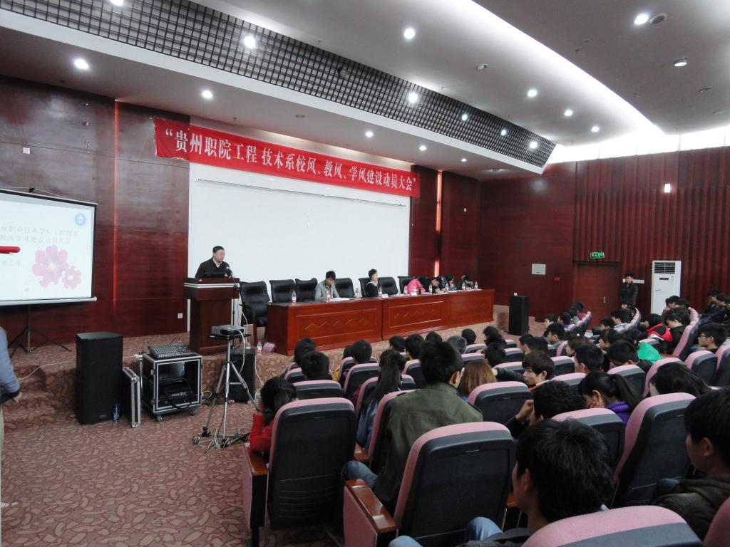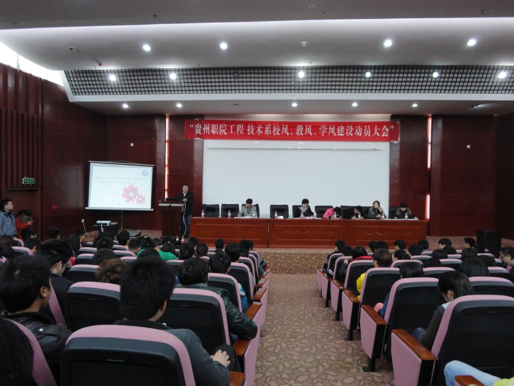 工程技术系党总支书记周吉萍结合学校的发展目标,为全体教职工及学生做了“三风”建设相关内容讲座,对教职工提出了严格遵守学校劳动纪律,并树立工程系良好的教风,对学生提出了严格遵守《贵州职业技术学院学生管理办法》、《贵州职业技术学院学生一日行为规范》,《贵州职业技术学院工程技术系学生管理实施细则》的要求,希望建立健全校风、教风、学风建设长效机制,把“三风”建设工作制度化、经常化、规范化和科学化,贯穿于整个教育工作之中。