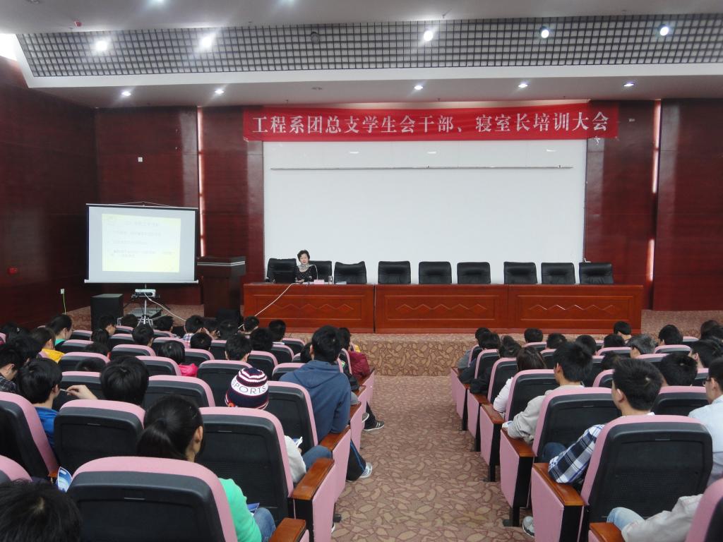 工程系为将校风、教风、学风“三风”建设落到实处,2013年3月13日中午12点30分在行政楼9楼会议室举行了2012—2013学年学生会干部、寝室长培训大会。系党总支书记周吉萍,团总支副书记陈娜老师、各辅导员、工程系学生会干部以及各寝室长参加了本次会议。