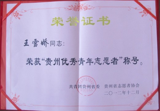 在刚刚结束的2012年全省优秀青年志愿服务集体、优秀青年志愿者评选中,我院青年志愿工作得到了团省委的充分肯定,并荣获“优秀青年志愿服务集体”荣誉称号,王雪娇同学荣获“优秀青年志愿者”荣誉称号。