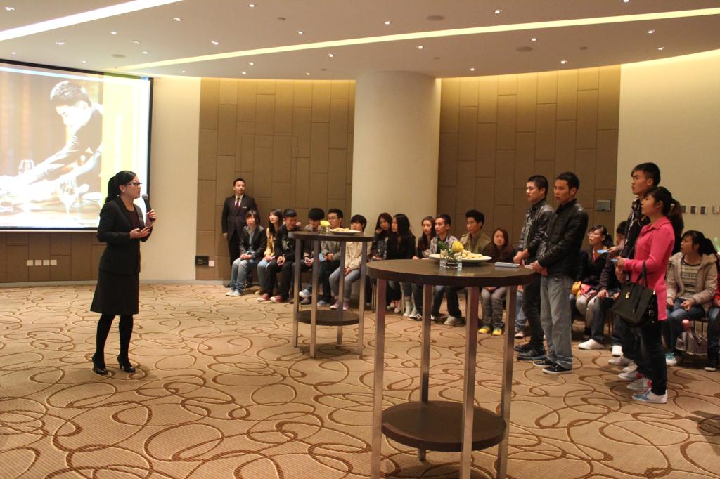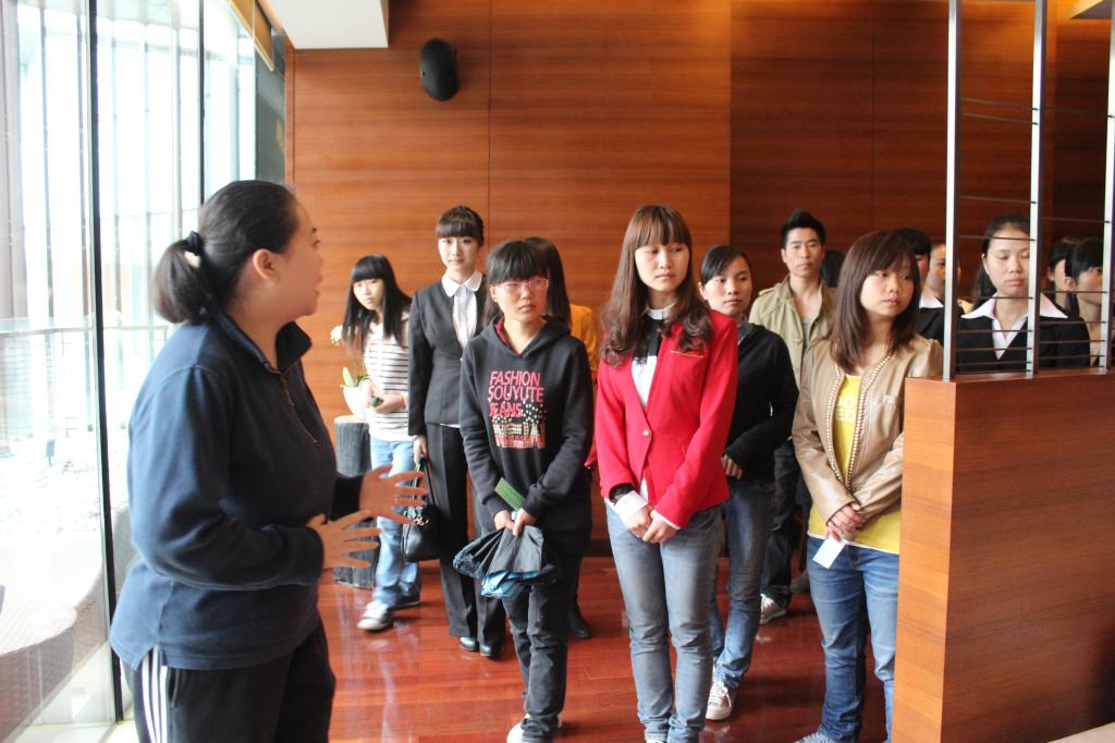 2013年,是我校进入内涵建设的第一年,为了强化以培养职业能力为核心的育人体系,进一步提高教学质量,深化课程改革,2013年3月26日上午,在我系领导孙燕书记、黄伟春主任的指导下,我系酒店管理专业及涉外旅游专业组织11级酒店管理专业的学生,前往我省五星级酒店——贵州中天凯悦大酒店(HYATT REGENCY GUIYANG)进行实地参观。本次活动得到了酒店方的大力支持与配合,在酒店人力资源部陈嵩经理的组织安排下,将我系学生分为四个组,分别由人力资源部的四个员工有序地带领同学们参观介绍酒店前厅部、客房(豪华标间、豪华单人间、行政套房、普通套房)、餐厅(中餐厅、西餐厅)及各工作部门。介绍中,他们从酒店实际工作要求出发,就《前厅服务技能》、《客房服务技能》、《餐饮服务技能》三门酒店管理专业的核心课程进行重点理论剖析,也使学生进一步了解酒店的工作内容,培养了同学们对各个专业岗位的认知能力。