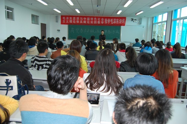 2013年3有26日下午在A706教室,商贸系12级法律事务专业的全体同学开展了《毛泽东思想和中国特色社会主义理论体系概论》实践教学活动——《我学毛泽东诗词》。毛泽东自称马背诗人,毛泽东诗词是毛泽东同志一生戎马的见证,诗词中包含的红色革命、红色精神以及红色经典中的世界观、价值观,渗透着毛泽东思想哲理,是毛泽东思想的完整体现。