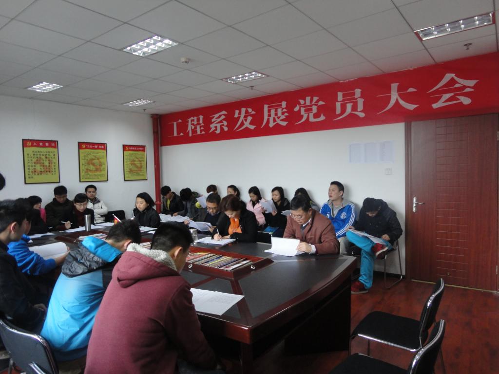 2013年4月11日,工程技术系党支部于行政楼322会议室召开了“工程技术系党员大会”,参加本次会议的有工程技术系党总支书记周吉萍、工程技术系副主任韩跃武、全体党员、入党积极分子。会议的主要议程是讨论夏子林等19名学生入党积极分子发展为预备党员事宜,会议过程严肃、规范,每位发展对象宣读了《入党志愿书》的同时就进入大学后的思想、学习、工作、生活等方面向党组织进行了深入地汇报,第一介绍人和第二介绍人对发展对象的个人审查情况进行了介绍,并发表了意见。同时,也指出了发展对象的缺点和不足。