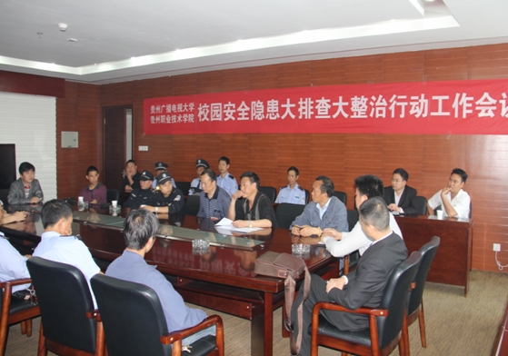 根据省综治委校园及周边综合治理专项组关于印发《全省校园及周边治安综合治理大排查大整治实施方案》(黔校园安全组﹝2013﹞1号)、《省教育厅办公室关于盘县晴隆县发生校园斗殴致人死亡事故的通报》(黔教办安稳﹝2013﹞155号)、《贵州广播电视大学贵州职业技术学院2013年校园及周边治安综合治理大排查大整治实施方案》(黔电大校字﹝2013﹞58号黔职院字﹝2013﹞43号)文件精神,为深入贯彻落实省综治委、省教育厅和学校有关安全工作的通知精神,我校党委、行政高度重视。由保卫处牵头,邀请贵阳市观山湖区野鸭派出所张警官等3名警察到校,后勤处、宣传部和物业公司参与,于2013年4月18日在学生公寓进行了一次全面的安全隐患大排查大整治行动;同时通过拉横幅的形式进行宣传和教育,严防各类伤害事故和火灾等事故的发生。