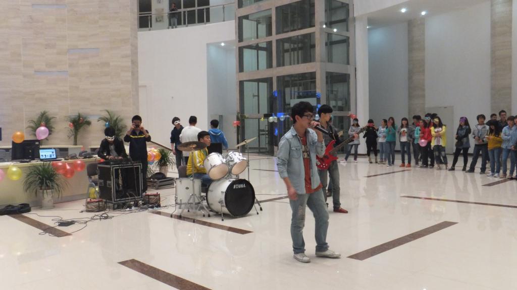 晚上7点,图书馆一楼大厅“歌舞青春面具舞会”现场,华灯璀璨,人头攒动,用80个学生的笑脸制作成的笑脸墙——青春纪念册,在闪烁的灯光下光彩夺目,青春四溢。