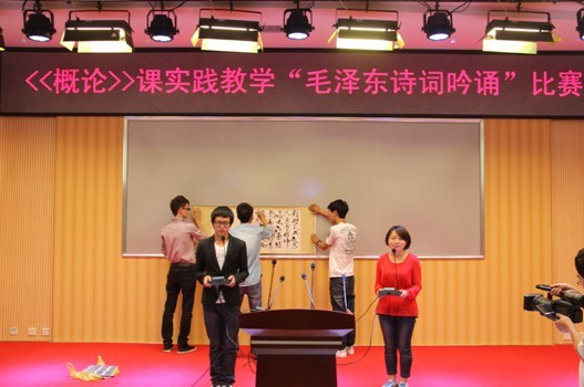 为了进一步活跃校园文化气氛,丰富思想政治理论课的教学形式,领略伟人崇高的革命感情、遒劲的创造力量、博大的艺术思想、精美的韵调辞采,给同学们一个展示自已的舞台,经过12级各个班级的初选,2013年4月19日下午14时,公共基础部思政教研室主办的“《毛泽东思想和中国特色社会主义理论概论》课实践教学“毛泽东诗词咏颂比赛”在图书馆二楼会议室举行。思政课全体教师和2012级所有班级的学生代表参加了比赛。