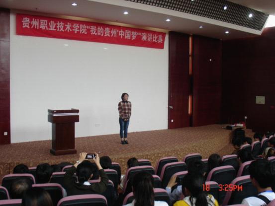 近日,“我的贵州‘中国梦’”主题演讲比赛在贵州职业技术学院行政楼9楼隆重举行。本次比赛由商贸系承办,党委宣传部主办。特邀嘉宾孙鲁痕教授、公共基础部陈国敏主任、党委宣传部张仁俊部长、商贸系党总支刘德刚书记以及院团委副书记陈鹰出席本次大赛并担任评委。