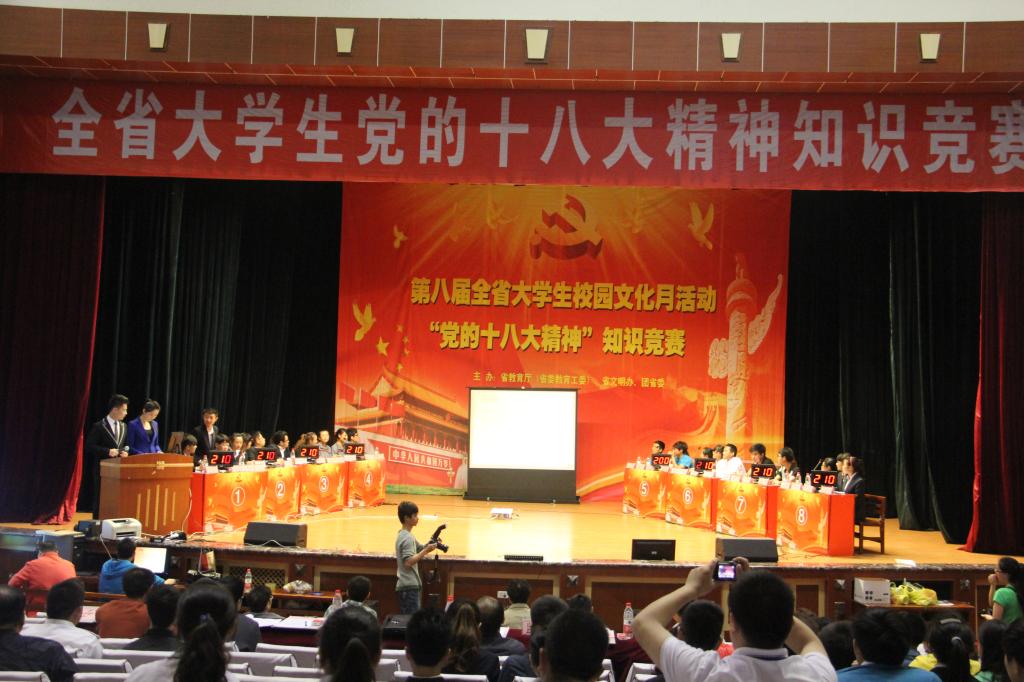 2013年5月18日,通过校内选拔,由我系代表学校组队参加了第八届全省大学生校园文化月“党的十八大精神”知识竞赛。本次竞赛在贵州师范大学大礼堂举行。