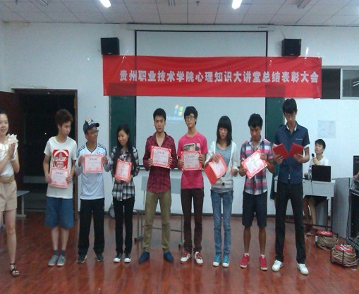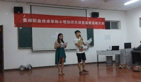 2013年6月20日晚上7点,由我院基础部主办的贵州职业技术学院心理知识大讲堂总结表彰大会在A709举行。讲师代表、学生代表、社团代表分别发表感言,各兄弟社团送来精彩的文艺节目,表达对此次活动取得圆满成功的祝贺。