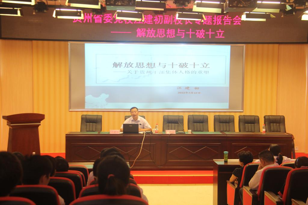 2013年7月17日,中共贵州省委党校副校长、贵州行政学院副院长汪建初同志到我校做了题为《解放思想与十破十立》的专题讲座。学校处级以上干部以及全校教职工、学生代表共计200余人参加讲座。讲座由党委副书记江龙华主持。
