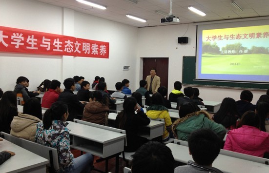 为帮助学生了解生态文明知识,树立生态文明理念,走近绿色低碳生活,2013年11月21日下午2:00-4:00,公共基础部任健教授在B803大教室为我院2013级新生进行了题为“大学生与生态文明素养”的讲座。任健教授首先从天安门广场60万块口香糖说起,引出讲座主题,然后以PPT为手段,声情并茂讲述了文明的生态转向、生态文明的含义和内容、生态文明的产生与兴起、全球及我国的生态现状,最后,联系现实生活重点讲解了大学生如何培养和提高生态文明素质。