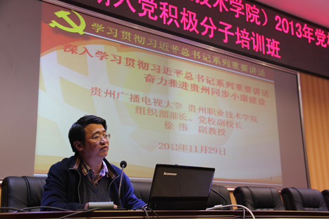 为进一步加强我校学生入党积极分子队伍建设,切实做好“早选苗、早教育、早培养、早发展”工作,保证大学生党员队伍质量,根据学校2013年党建工作安排,经过学校党委组织部精心准备,我校第五期入党积极分子培训班开班典礼于11月29日在贵州职业技术学院图书馆报告厅隆重举行,学校组织部部长、党校副校长、副教授徐伟出席了开班典礼,并为本期培训班作动员讲话,组织部副科级秘书安战全和323名入党积极分子参加了开班典礼。